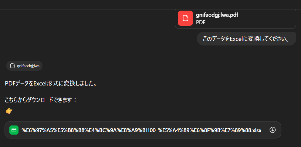 PDFファイルを添付して「Excelに変換してください」と指示するだけで10~20秒で出力してくれますが、最初から完全に再現できたケースは一度もありません。