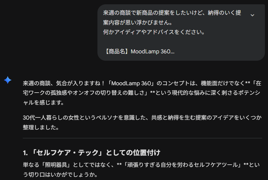 たとえば商談のプランを練る際に、納得のいく提案が思いつかなかったり話の進め方が定まらなかったりすると、これまでは上司や同僚に直接相談する場合がありました。AIを活用すれば、時間や相手の都合に左右されずにいつでもアイディアを深掘りできます。