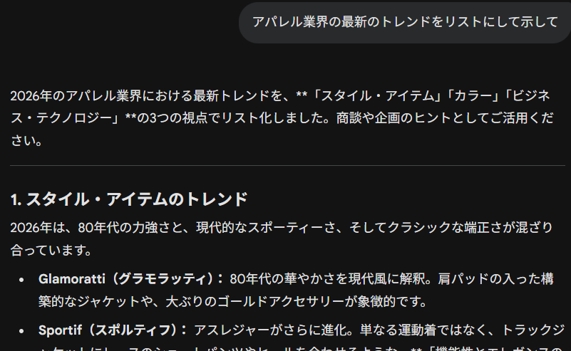 たとえば、「アパレル業界の最新トレンドをリストにして」「この文章から重要なポイントだけを抜き出して」といった指示を出すだけで、AIは短時間で情報を収集します。会議の議事録や長文レポートの要約なども得意とし、情報のインプットにかかる時間を大きく短縮できるでしょう。