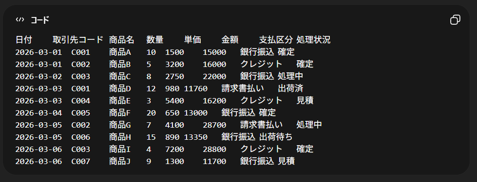 筆者はFAXで届いた書類のスキャンデータを読み込ませ、以下の画像のようにChatGPTでTSVデータ(テキスト形式のファイル)に変換してNotionにデータベースとして保存しています。