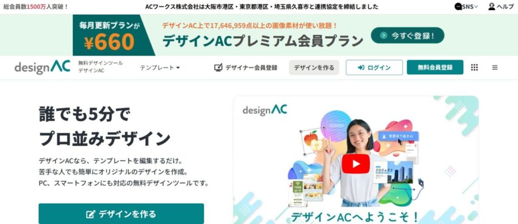 デザインACは、無料写真・イラスト素材で有名なACワークスが提供する、オンラインの無料デザイン作成ツールです。