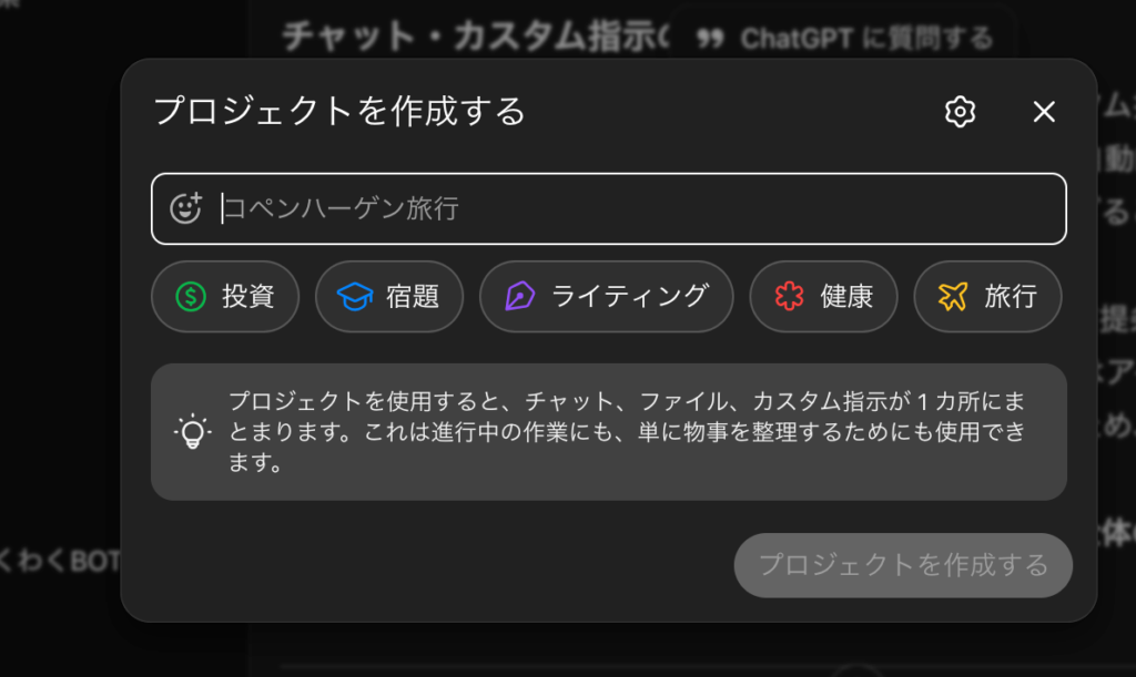 ChatGPT Projectsを使う最初のステップは、プロジェクトの作成です。画面上のProjectsメニューから新規プロジェクトを選び、名称を設定するだけで作業スペースが作られます。