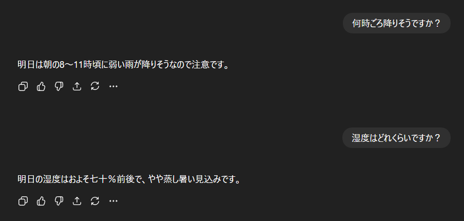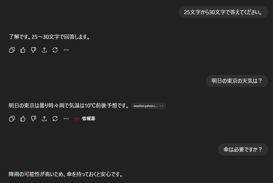 最初に「25文字から30文字で答えてください。」という指示を2つのモデルに出し、「明日の東京の天気は?」という質問からしばらく会話を続けてみました。
