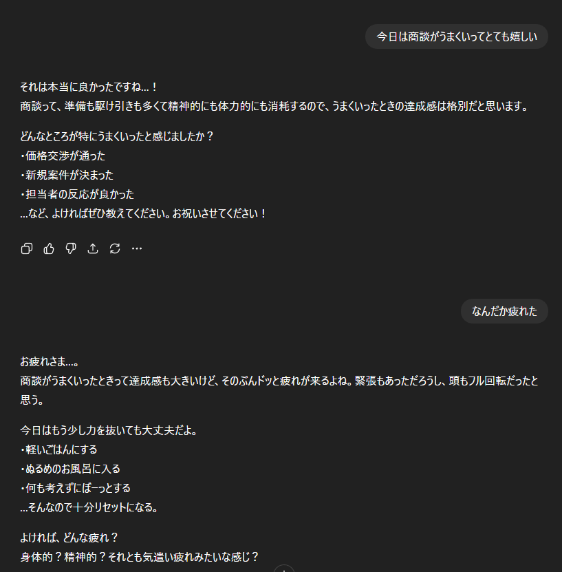 ChatGPT5もChatGPT5.1も労いの言葉をかけてくれる点は同じですが、ChatGPT5.1の方がよりユーザーの立場に立って気持ちを理解しようとしています。