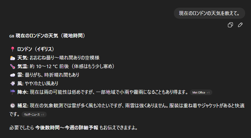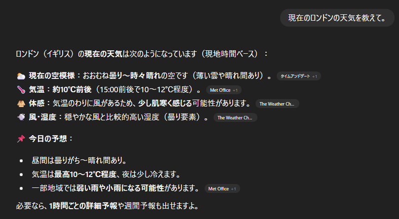 それぞれ回答までにかかった時間は、ChatGPT5が約4秒、ChatGPT5.1が約3秒でした。このあと、「明日のロンドンの天気を教えて」「週間予報を教えて」と続けてプロンプトしましたが、平均で1秒から2秒の差でChatGPT5.1の方が早く回答を出しました。