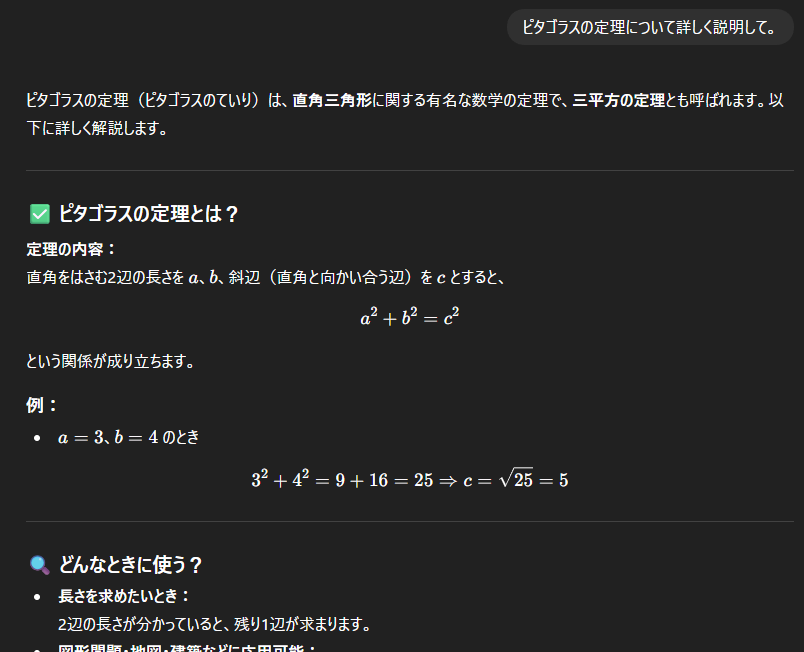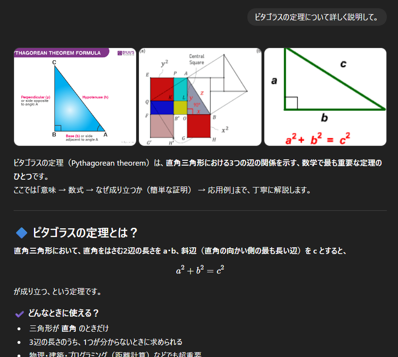 「ピタゴラスの定理について詳しく説明して。」というプロンプトを2つのモデルに投げました。先ほどの簡単なリサーチと条件を合わせるために、思考モードはここでもInstantモードを使用しています。
