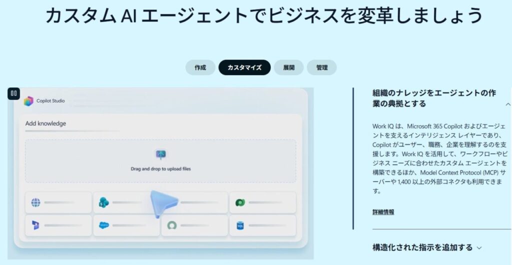 Microsoft 365 Copilotの料金でCopilot Studioにアクセスでき、自社の専用エージェントをノーコードで作成できます。