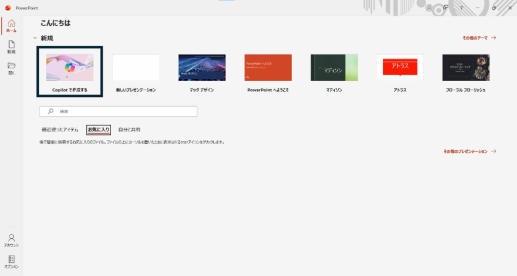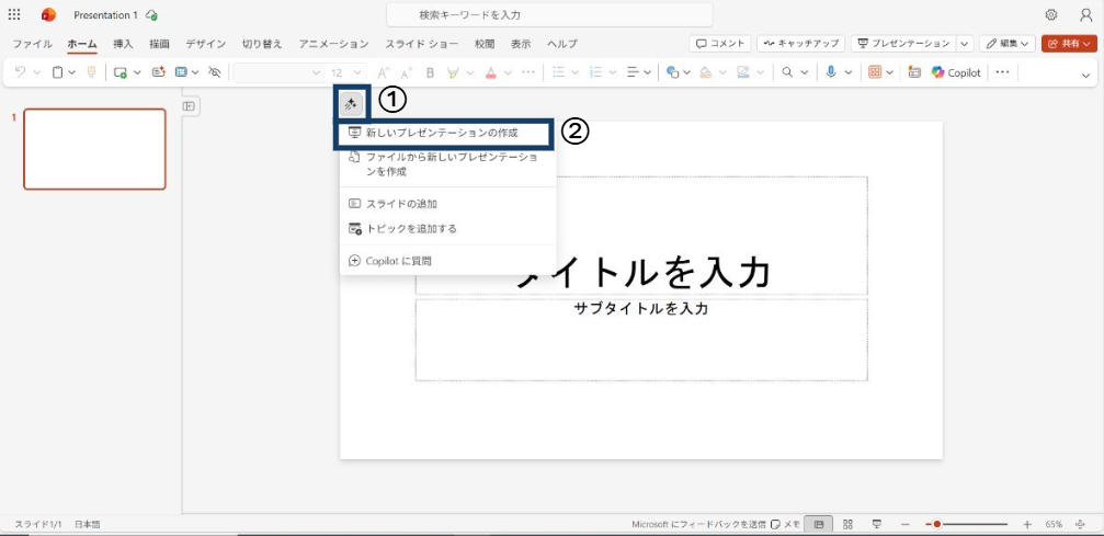 1.PowerPointのホーム画面からCopilotを起動する