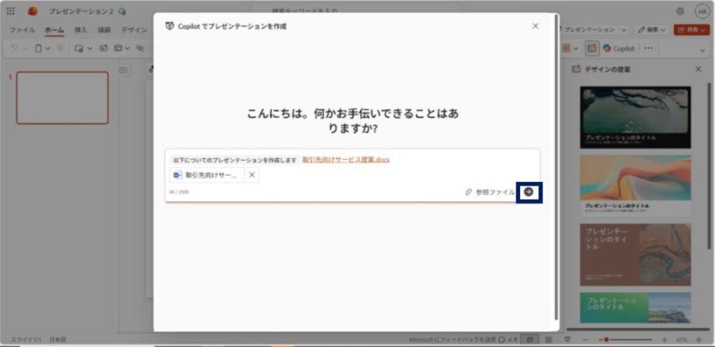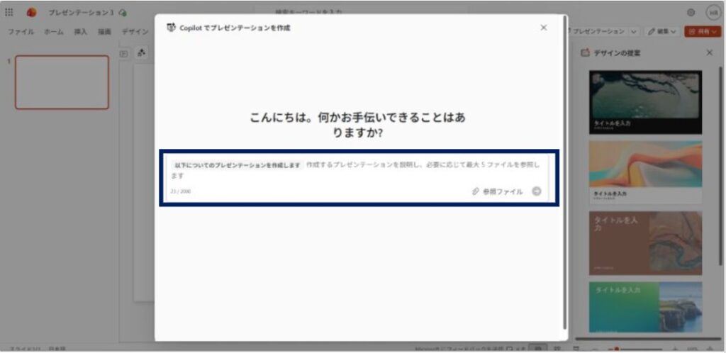 Copilotパネルの入力欄に、作成したいプレゼンのテーマや条件を入力して送信。