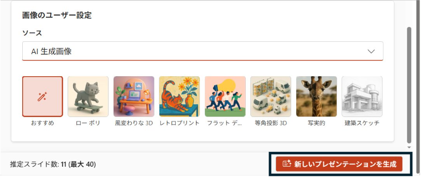 内容を確認・編集したら、プレゼンテーションのスタイルと画像スタイルを選択し、「新しいプレゼンテーションを生成」のボタンをクリックしましょう。