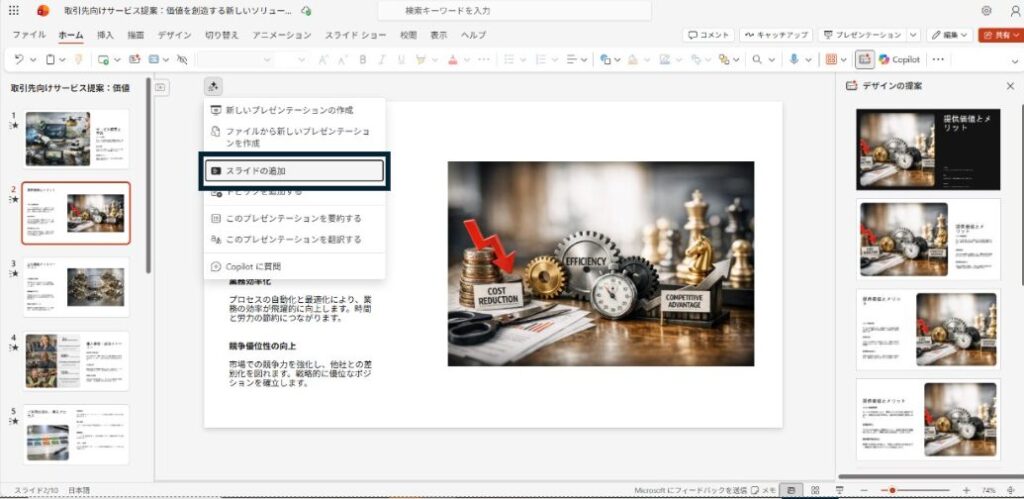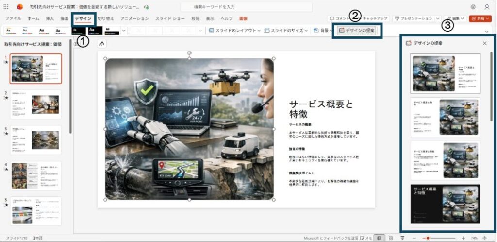 画面右側に「デザインの提案」パネルが開き、複数のデザイン候補が表示されます。