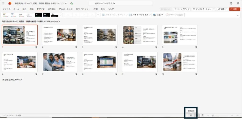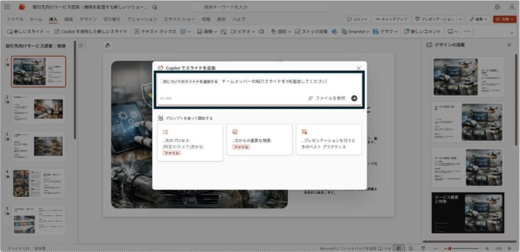 今回は「取引先に提案するサービス紹介のスライドを10枚作成して」と入力します。