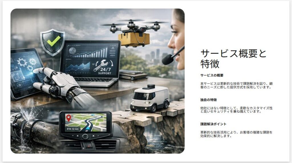 たとえば「取引先の担当者向けに、新サービスの導入メリットを伝える提案資料を10枚で作成してください」のように伝えると、構成・文体・情報量が的確になります。