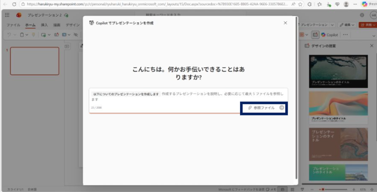 プロンプトを使った作成方法と同じように「新しいプレゼンテーション」の作成をクリックし、「参照ファイル」を選択します。