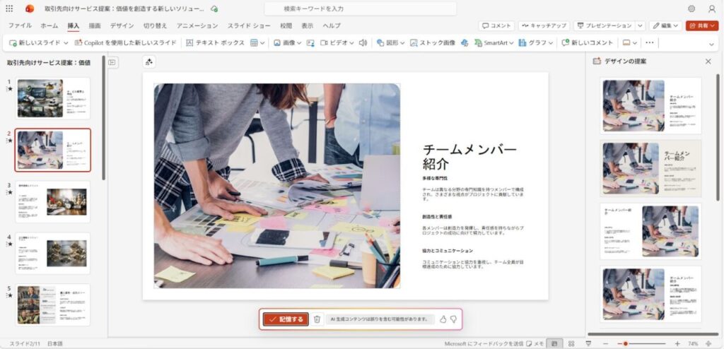 個人向けのMicrosoft 365 Personalはスライド生成機能が限定的で、クオリティが低くなる場合があります。