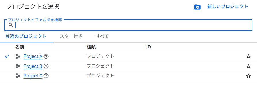 Google Cloud Consoleでは選択中のプロジェクトが左上に表示され、ここをクリックすると別のプロジェクトに切り替えられます。
