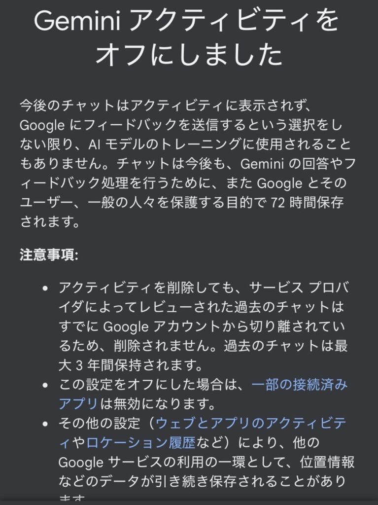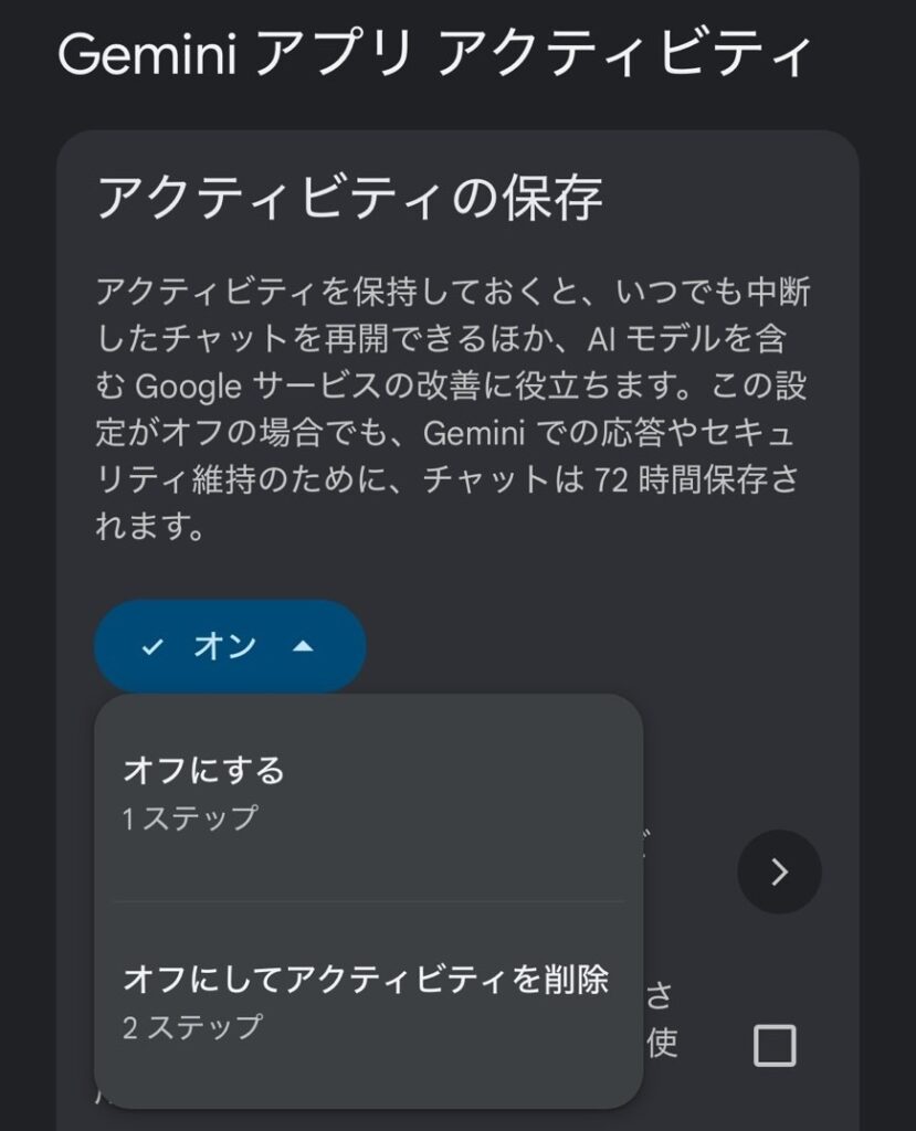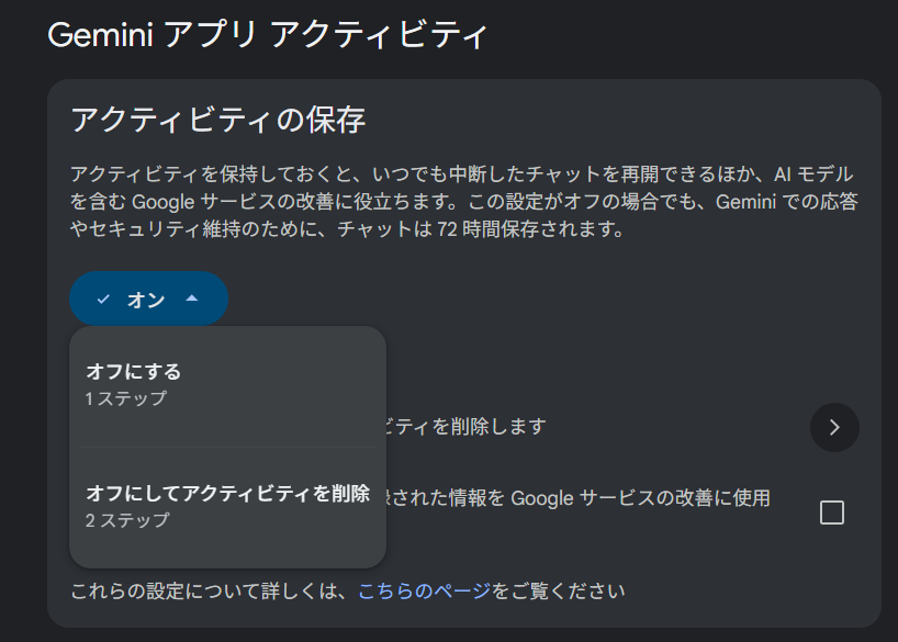 どちらの設定もこれから先の会話データがGeminiの学習に使われなくなる点は同じですが、「オフにする」は過去の履歴が残るのに対し、「オフにしてアクティビティを削除」は過去の履歴も一定時間(最大72時間)が経てば削除されます。