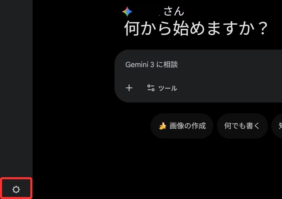 WebブラウザでGeminiを開き、右下の設定ボタンをクリックします。