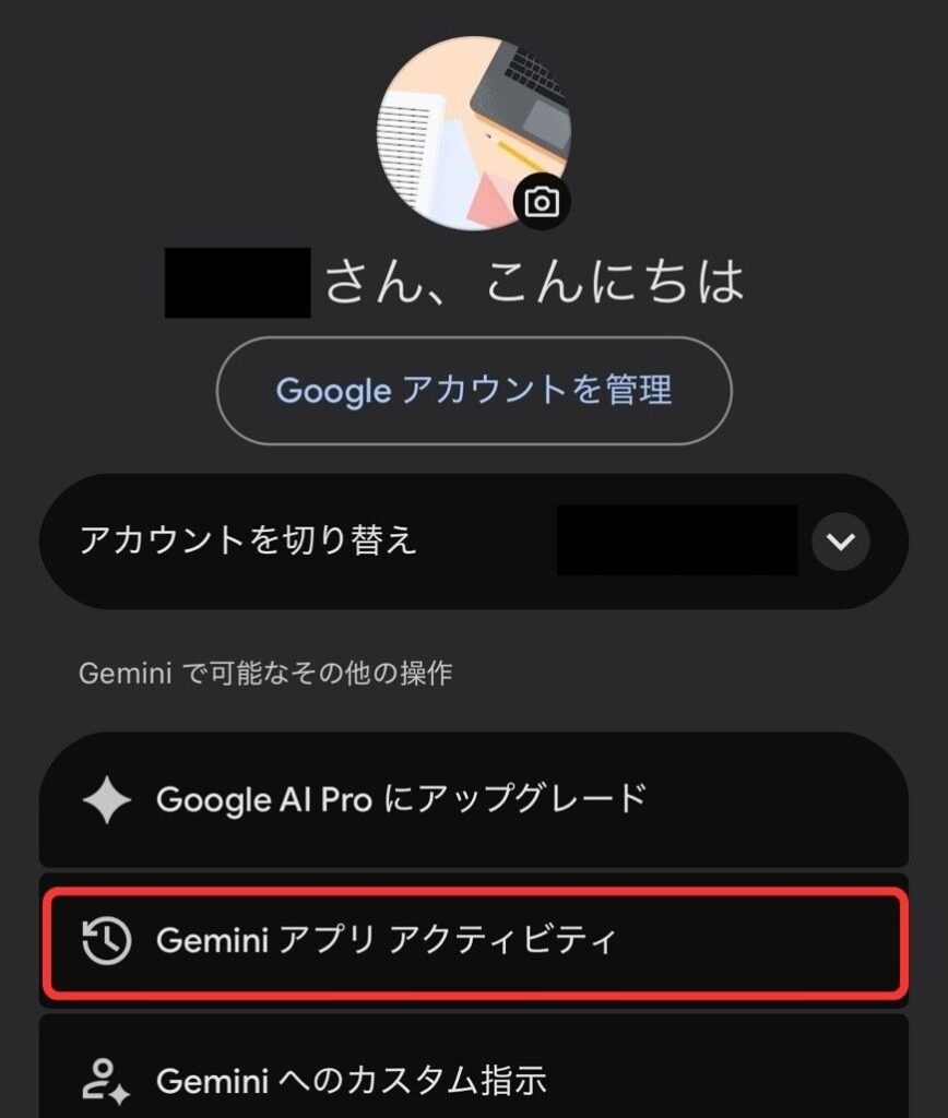 今回は「オフにする」を選択しました。以下の画像のように「Geminiアクティビティをオフにしました」と表示されます。