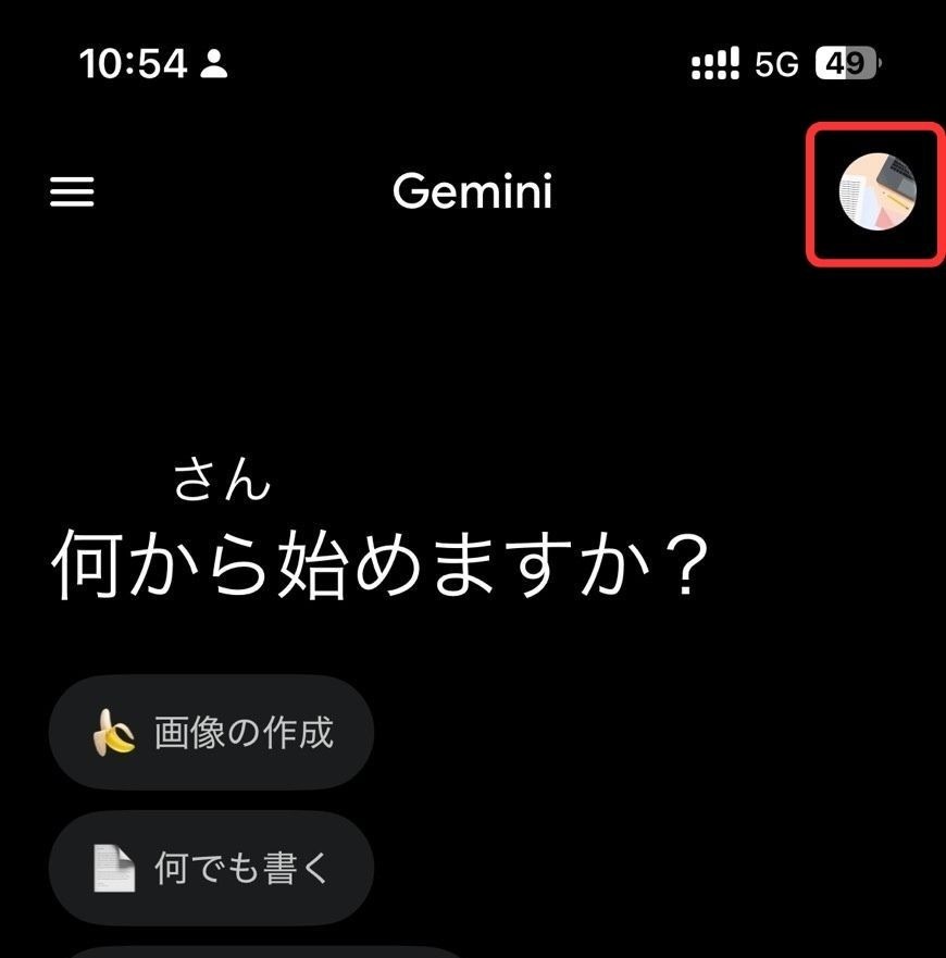 スマホでGeminiアプリを開き、右上のアイコンをタップします。