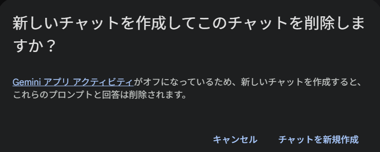 また、ページのリロードやタブを閉じて再度開き直すと、Geminiからの確認なしにそれまでのチャットは削除されます。